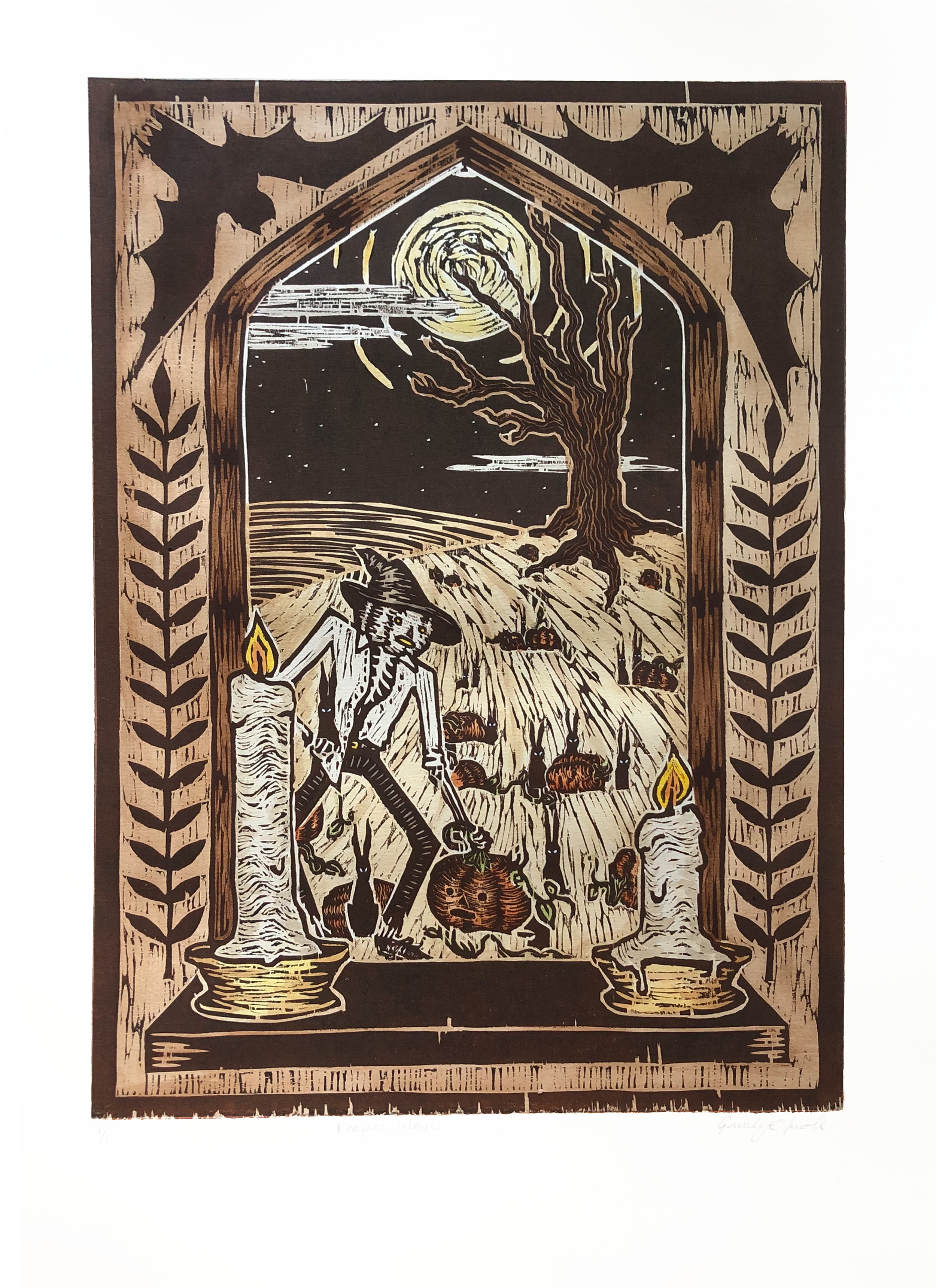 Reaper Man, 15x22 in. hand-carved woodcut print on BFK Rives paper, painted with watercolor. 2021.